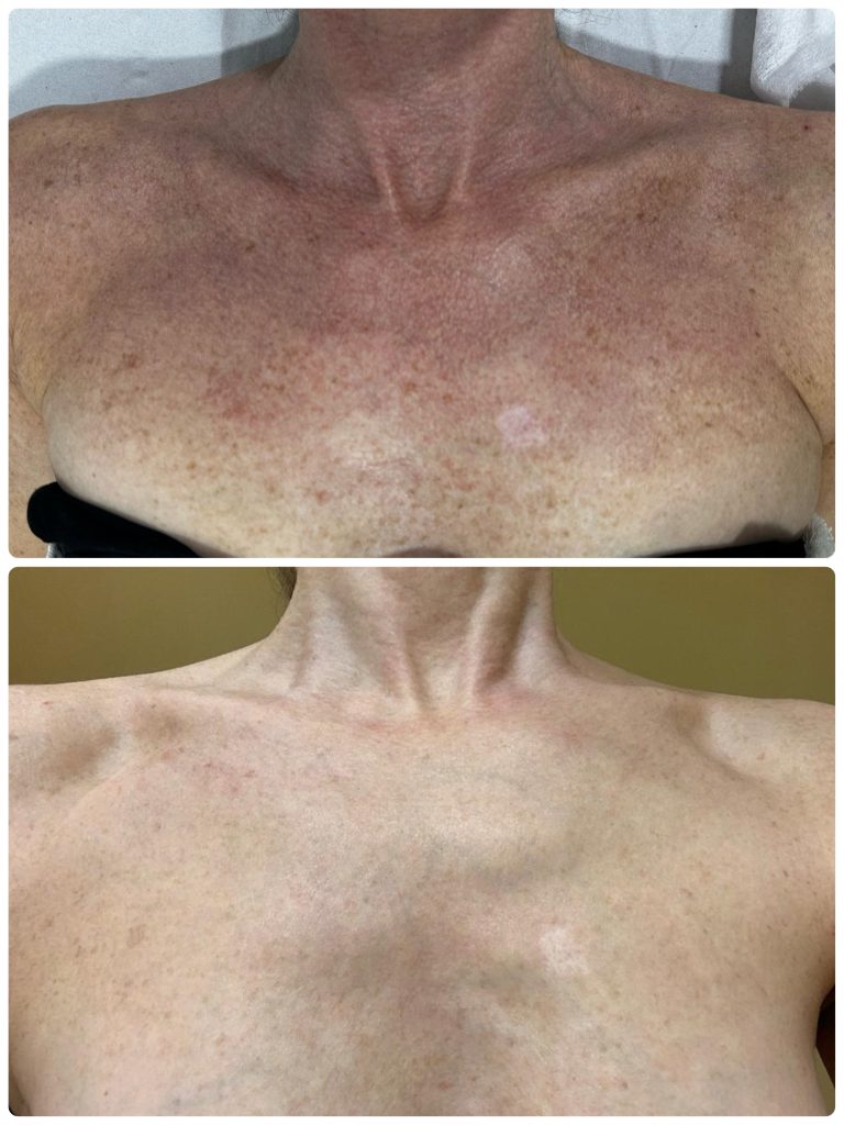 Rejuvenecimiento de manchas escote, resultado tras una sesión de IPL. Fotos enviadas por los pacientes tras mes del tratamiento.